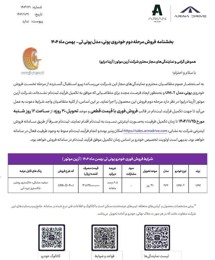 آرین موتور پویا فروش کراس‌اوور اسپرت چانگان UNI-T مدل ۲۰۲۶ را با قیمت قطعی ۴,۱۱۲,۶۰۰,۰۰۰ تومان و تحویل فوق‌العاده سریع ۳۰ روزه از امروز ۲۱ بهمن آغاز کرد؛ موتور ۱.۵ توربو ۱۷۸ اسب، گیربکس ۷ سرعته دوکلاچه، سقف پانوراما، دوربین ۳۶۰ درجه، کروز تطبیقی و امکانات لوکس کامل. ثبت‌نام آنلاین تا ۲۵ بهمن در sales.arinadrive.com