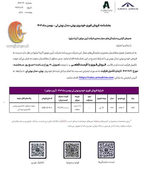 شرایط فروش چانگان یونی تی توسط آرینا درایو برای بهمن‌ماه ۱۴۰۴ با قیمت قطعی ۴ میلیارد و ۱۱۲ میلیون تومان اعلام شد. ثبت‌نام از ساعت ۱۱ صبح روز سه‌شنبه ۲۱ بهمن آغاز می‌شود و شرکت وعده تحویل خودرو را ظرف ۳۰ روز پس از تکمیل خرید داده است.