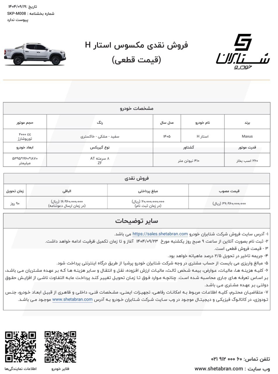 شرایط فروش مکسوس استار H شتابران خودرو بهمن 1404