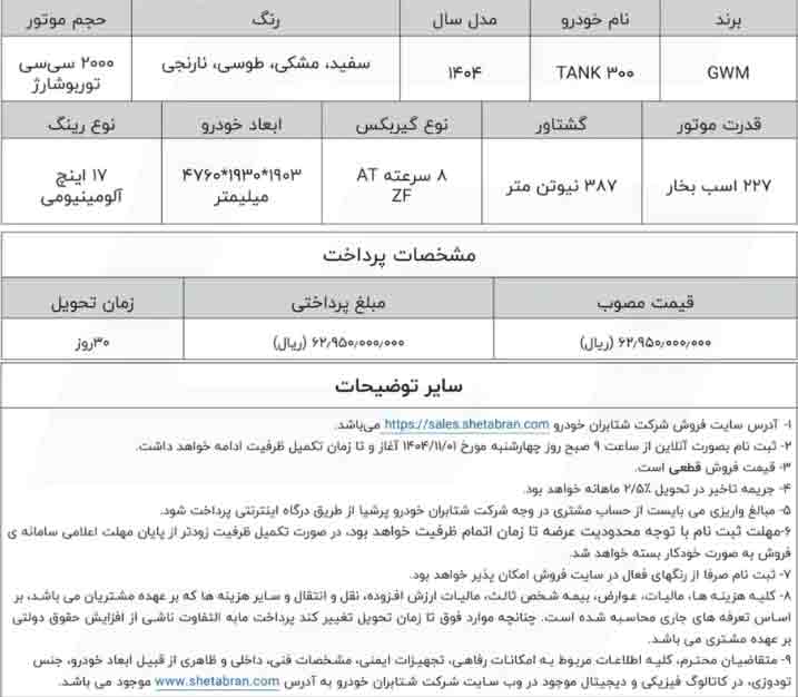 شرایط فروش تانک 300 شتابران خودرو ویژه مهر 1404