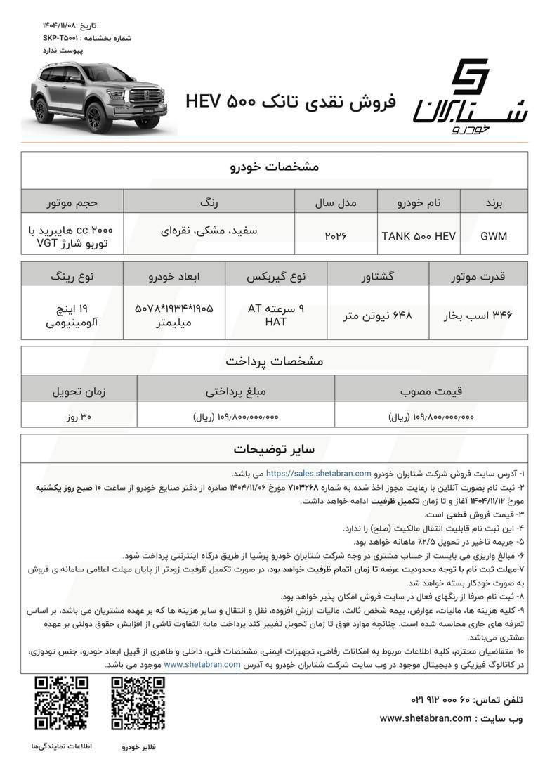 شرکت شتابران خودرو اولین شرایط فروش فوری و نقدی تانک ۵۰۰ هیبرید را با قیمت قطعی ۱۰ میلیارد و ۹۸۰ میلیون تومان اعلام کرد. به گزارش خودرولوژیست، این شاسی‌بلند قدرتمند با خروجی ۳۴۶ اسب‌بخار و گشتاور خیره‌کننده ۶۴۸ نیوتن‌متر، از ساعت ۱۰ صبح روز یکشنبه ۱۲ بهمن ۱۴۰۴ به صورت آنلاین قابل سفارش است. تانک ۵۰۰ که با گیربکس ۹ سرعته اتوماتیک و سیستم دو دیفرانسیل پیشرفته عرضه می‌شود، با موعد تحویل ۳۰ روزه در رنگ‌های سفید، مشکی و نقره‌ای در دسترس متقاضیان قرار می‌گیرد تا رکورددار گران‌ترین خودروی مونتاژی بازار ایران در سال جدید باشد.